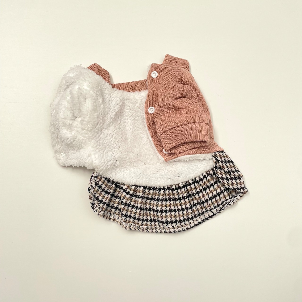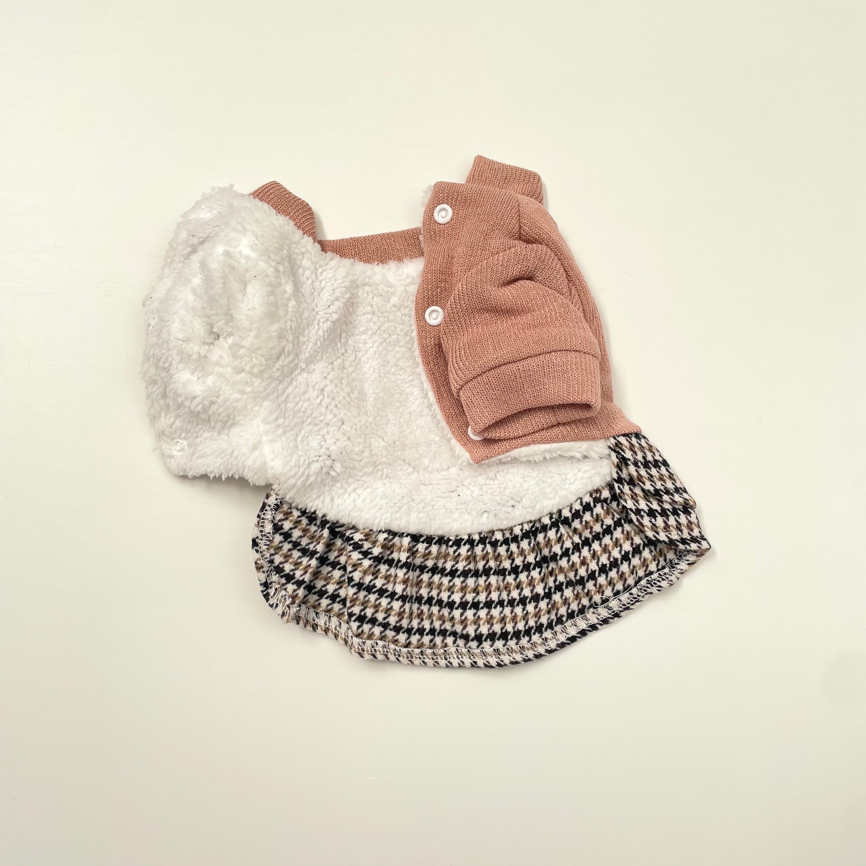 ハイネックカットソーとサスペンダースカートがドッキングした一枚でかわいいワンピース。